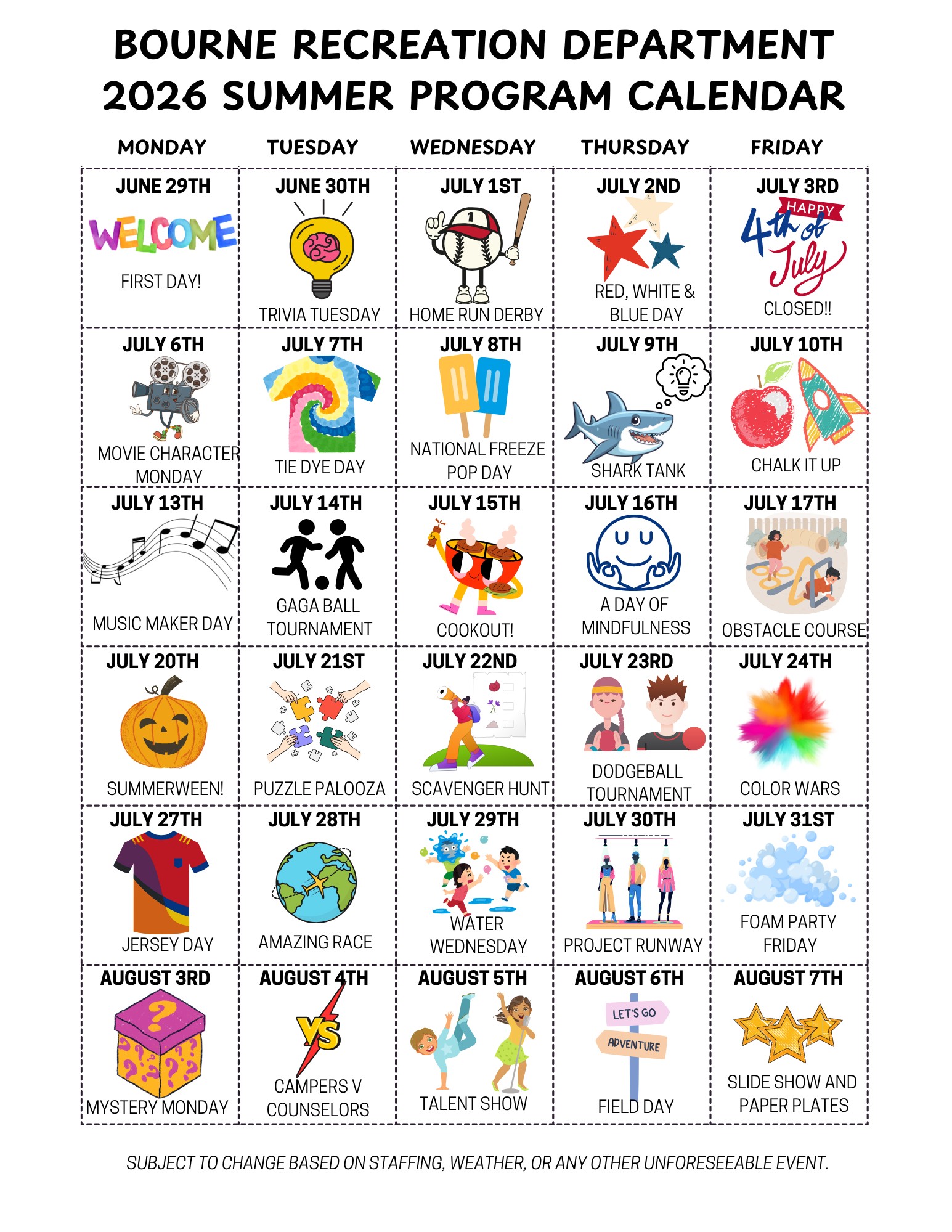 We remain deeply committed to keeping Bourne Rec programs affordable for our families. After five seasons without an increase to the Summer Program fees, a slight adjustment is necessary to help offset rising costs for equipment, supplies, and staffing. As a self-supported program that many families rely on for quality summer care, we are proud to share that even with this increase, the 6 week cost remains just $4.50 per hour and continues to provide an accessible and valuable option for our community.